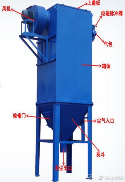 n除尘器由上箱体、灰斗,卸灰阀和喷吹清灰系统组成。 上箱体由花板上下分为净气室和袋室两部分,箱体:包括袋室、净空气、多孔板、滤袋、滤袋笼架、检修门,箱体设计耐压为5000pa。净气室在上部包括出风口和顶部检修门,出风系统:包括风机、风机配用电机。脉冲喷吹系统的喷吹管也是安装在净气室;喷吹系统包括控制仪表、控制阀、脉冲阀喷吹管和气包。喷吹系统:包括气包、喷吹管、脉冲阀、控制仪。滤袋安装在花板上内部由滤袋框架支撑; 灰斗由灰斗、进风口及检查门组成。