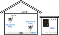 2.检测可燃气体比重小于空气时,可燃气体检测仪安装位置应该在疑似泄漏点上方,距离天花板不大于30-60cm,检测可燃气体比重大于空气时,可燃气体检测仪安装位置应该在疑似泄漏点下方30-60cm,距离地面不大于30cm;