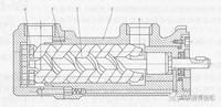 它主要是由固定在泵体中的衬套以及安插在泵缸中的主动螺杆和与其啮合的两根从动螺杆所组成。三根互相啮合的螺杆在泵缸内按每个导程形成为一个密封腔,造成吸口、排口之间的密封。泵工作时,由于两根从动螺杆与主动螺杆左右对称啮合,故作用在主动螺杆上的径向力完全平衡,主动螺杆不承受弯曲负荷。