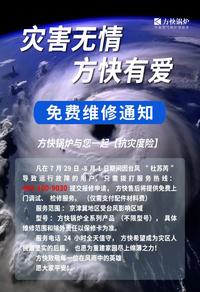 这两天,因台风“杜苏芮”导致的关于京津冀地区的暴雨甚至洪水的信息在整个网络广为传播,灾害强度和破坏性实属罕见。暴雨不停,树木倒伏,房屋、设备受到严重损害,给灾区人民的财产造成巨大损失。国家应急机制已经强势启动,方快守护倾情助力,将对因“杜苏芮”造成锅炉损坏或运行故障的用户提供免费维修服务。