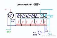 多级闪蒸(MSF)是将热盐水引入闪蒸室后过热而急速的部分气化,从而使热盐水自身的温度降低,所产生的蒸汽冷凝后即为所需的除盐水。多级闪蒸法不仅用于海水淡化,而且已广泛用于火力发电厂、石油化工厂的锅炉供水、工业废水和矿井苦咸水的处理与回收,以及印染工业、造纸工业废碱液的回收。