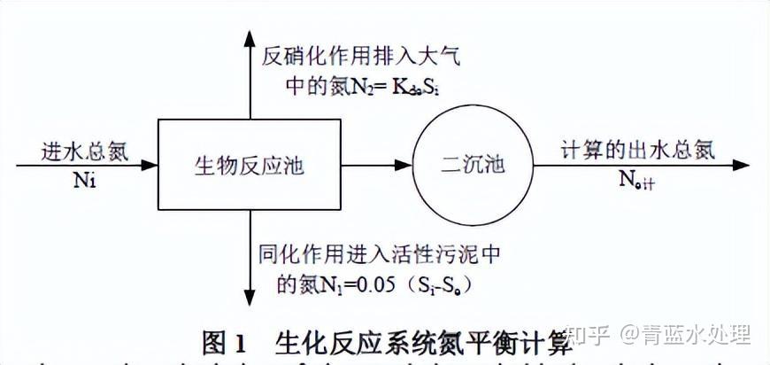 进水总氮进入到生物反应池,一部分通过反硝化作用排入大气,一部分通过同化作用进入活性污泥中,剩余的出水总氮需满足相关水质排放要求。