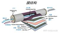 RO膜类似一个长信封状的膜口袋,开口的一边粘接在含有开孔的产品水中心管上。将多个膜口袋卷绕到同一个产品中心管上,使给水水流从膜的外侧流过,在给水压力下,使淡水通过膜进入膜口袋后汇流入产品水中心管内。为了便于产品水在膜袋内流动,在信封状的膜袋内夹有一层产品水导流的织物支撑层;为了使给水均匀流过膜袋表面并给水流以扰动,在膜袋与膜袋之间的给水通道中夹有隔网层。