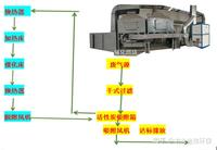 系统由2个活性炭吸附箱和1个催化燃烧床构成,将各条生产线中所排放的废气经收集汇总后送入净化设备,在吸附净化装置与废气之间安装一套干式过滤预处理装置,过滤少量的粉尘颗粒,从而避免活性炭微孔被堵塞,然后送入活性炭吸附箱进行吸附净化,当任一活性炭吸附器接近饱和时,系统将自动切换到备用活性炭吸附箱(此时饱和活性炭吸附箱停止吸附操作),然后用热气流对饱和活性炭吸附箱进行解吸脱附,将物从活性炭上脱附下来。在脱附过程中,废气已被浓缩,浓度较原来提高十几倍,达1500ppm以上,浓缩废气送到催化燃烧装置,后被分解成CO2与H2O排出。