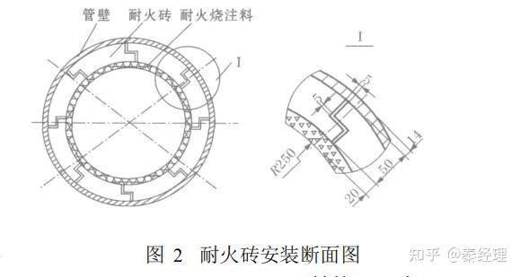 带有粉尘颗粒的高温气体流经管道时不断冲刷管道衬里,所选用的衬里材料既要耐高温又要耐冲刷。在浇注料中镶嵌耐火砖可以增加衬里的耐冲刷性,因此,改进后的衬里结构设计为耐火砖上涂抹耐火浇注料。为了使衬里更加耐冲刷,并防止气体泄漏到管道内壁,在管道径向方向上设计8块耐火砖,每两块砖之间凹凸安装,安装断面结构如图 2所示。