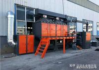 废气的吸附浓缩主要利用的是活性炭的吸附作用。本套设备由几套活性炭吸附箱组成,本系统运行时先打开第一套活性炭吸附箱,将工业废气进行吸附浓缩,第一套活性炭吸附饱和后,再打开第二套活性炭吸附箱进行与第一套活性炭吸附箱类似的吸附过程,在第二套活性炭吸附箱工作的同时,第一套活性炭吸附箱发生解吸。依此类推,此套系统里的活性炭吸附箱循环的进行着吸附和解吸的过程,解吸后的工业废气进入催化燃烧设备,最终废气被氧化分解成无毒无害的小分子化合物,达标排放。