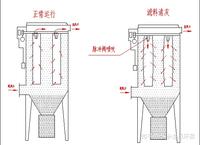 脉冲反吹布袋除尘器原理图,含尘气体从袋式除尘器入口进入后,通过烟气分配装置均匀分配进入滤袋,当含尘气体穿过滤袋时,粉尘即被吸附在滤料上,而被净化的气体则从滤袋内排除。当吸附在滤料上的粉尘达到一定厚度时,电磁阀开启,喷吹空气从滤袋出口处自上而下与气体排除的相反方向进入滤袋,将吸附在滤袋外表面的粉尘清落至下面的灰斗中。