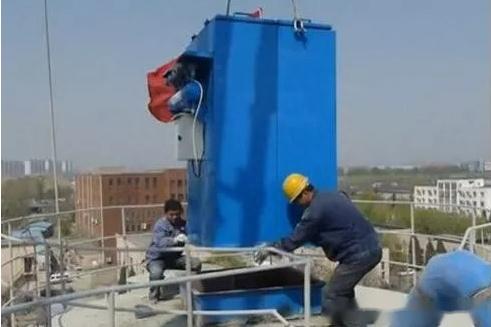 3、焊接好底法兰,准备好石棉绳或玻璃胶来密封法兰对接处,开始吊装除尘器上箱体,对好法兰孔,穿螺丝加石棉绳或玻璃胶,箱体等各法兰之间应嵌入密封填料才能拧紧螺栓,防止漏气。箱体安装应垂直,保证设备水平放置。将安装底座(随机固定在除尘器上)水平地焊接在水泥仓顶,上下法兰对齐。