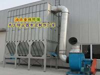 含尘气体由进气口进入灰斗,粉尘与导流板发生碰撞,较粗颗粒的粉尘在撞击下受惯性力和重力的作用落入灰斗,较细的粉尘以均匀的速度进入箱体,经滤袋过滤后,粉尘被挡在滤袋的外面,气体通过滤袋成为干净的气体,经净化后的气体沿滤袋内部进入净气室,通过风机排除。