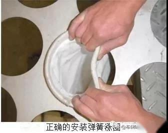 4、然后将袋口上部的弹簧圈捏成凹型,放入箱体的花孔板中。以双手紧握槽型弹性涨圈(不需把除尘布袋拉起),双手把弹性涨圈往里压使之成“C”形。在保持弹性涨圈成“C”形的同时,放置弹性涨圈隆起的一边到最近的花板孔边。一手握着已装嵌好的隆起的“C”形弹簧环圈的一边,另一只手把隆起的“C”形固定在花板边。