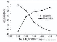 进一步进行验证。在原水总硬度 556 mg/L、pH为 7.4、硅含量为 28 mg/L、Ca(OH)2 加入量为 1 000mg/L 条件下,拉大 Na2CO3 加入量的范围,结果如图 4 所示。得出同样的结论,硬度去除率升高的同时硅的去除率降低,硬度的去除率最高可达 95%。从以 上结果可以看出,二氧化硅的去除与总硬的去除是 一个矛盾体,硅的去除率与总硬度的去除率呈现相反的趋势。