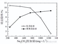 在原水总硬度 648 mg/L、pH 为 8.35、硅含量为32 mg/L、pH 加入量为 2200 mg/L 条件下,Na2CO3 加入量对反渗透浓水除硅除硬度的影响如图 3 所 示。由图 3 可知,随着 Na2CO3 加入量的增加,硅的去 除率逐渐降低,但是硬度的去除率逐渐上升。