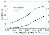 在实验室过程中 pH 随着 Ca(OH)2 投加量的增 加而增加,因此,进一步追加实验,同时检测反应过 程中 pH 的变化,结果如图 2 所示。由图 2 可知,在 原水总硬度 648 mg/L、pH 为 7.75、硅含量为 31mg/L 条件下,随着 Ca(OH)2 加入量的增加,硅的去 除率逐渐提高,并且 pH 也在增加。这可能是由于Ca(OH)2 加入量增加,pH 升高,导致硅溶解度增加, 进而有更多的可溶解硅与 Ca(OH)2 反应被去除。