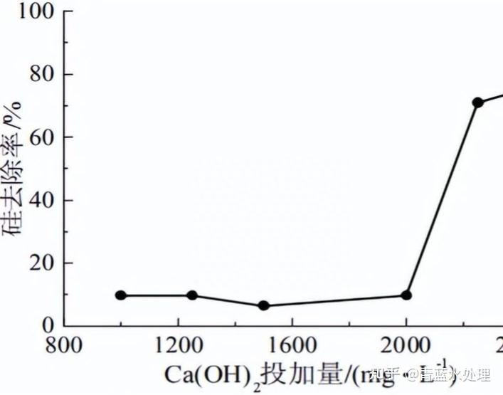2.1.1 石灰加药量的影响 在原水总硬度 556 mg/L、pH 为 7.4、硅含量为28 mg/L 条件下,只加入 Ca(OH)2,Ca(OH)2 加入量对反渗透浓水除硅的影响如图 1 所示。由图 1可知,在含量在 2 000 mg/L 以下,硅的去除率变化不大,并 且去除率很低,Ca(OH)2 的加入量超过 2 000 mg/L后,去除率迅速上升。
