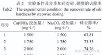 由表 2 可知,随着 Ca(OH)2 和 Na2CO3 加入量的增加,硅和总硬度的去除率同时逐渐上升,总硬度去 除率可达 97.5%,硅的去除率可达 84%。因此除硬度 和除硅可以分为两步走,先投加足量的 Ca(OH)2 将 硅降低到一个相对较低的范围,然后取上清液再投加Na2CO3 降低总硬,可同时达到高效除硅除硬的效果。