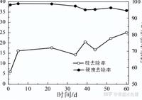 2.2.2 工艺应用效果 项目高密池工艺从 2018 年 8 月 20 日至 10 月20 日的运行情况见图 5。由图 5 可知,来水总硬度去 除率稳定在 95%以上,说明高密池工艺可以很好的去 除水中硬度,但是硅的去除率比较低,这与前文实验结果吻合,所以后续高密池可以进行改进,先投加 足量的 Ca (OH)2 将硅降低到一个相对较低的范围,经过沉淀后,上清液进入后续反应池再投加 Na2CO3 降低总硬度,可同时达到高效除硅除硬的效果。
