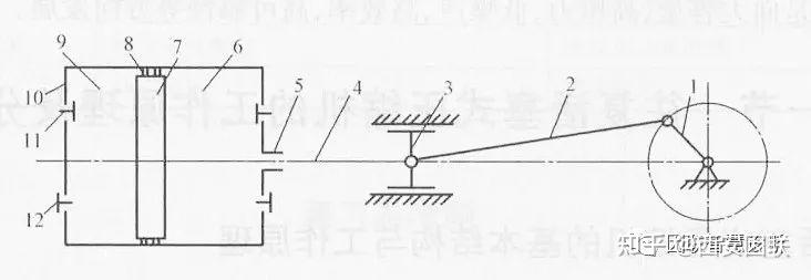 1—曲柄;2—连杆;3—十字头;4—活塞杆;5—填料;6—轴侧工作腔;7—活塞;8—活塞环;9—盖侧工作腔;10—气缸;11—吸气阀;12—排气阀