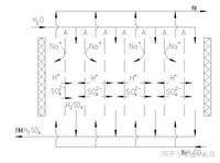 溶液中回收废酸为例进一步阐述扩散渗析的过程,如图1:扩散渗析示意图所示。回收酸需采用阴膜,阴膜带正电,允许SO42-通过。在浓度差推动下,原液室中的SO42-向回收室的水中扩散渗析。除本身带电外,离子交换膜孔道具有一定大小,因此还有“分子筛”的作用。当SO42-向回收室迁移时,也会夹带H+及Fe2+过去,但因为H+小于Fe2+,H+随SO42-渗析过去,而大部分Fe2+被阻挡。同时回收室中OH-离子浓度比原液室中的高,通过阴膜进入原液室,与原液室中的H+离子结合成水。结果从回收室流出的是硫酸,从原液室流出的是FeSO42-残液。用扩散渗析法回收硫酸,只有原废水硫酸浓度大于10%时,才有实用价值