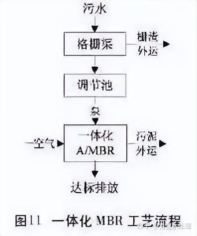 22、一体化MBR工艺:一种将活性污泥法和一体化浸没式膜分离系统结合的传统改良型工艺,利用膜组件进行的固液分离过程取代了传统的沉降过程,能有效的去除固体悬浮颗粒和有机颗粒,制备无菌水。系统出水可直接用于生产或生活回用。废水通过本处理系统处理排放出水的各项指标均可以达到《城市污水再生利用城市杂用水水质》的指定标准。该技术适用于有回用要求或用地紧张的的污水处理设施,处理规模20~500吨/天。工艺参数:缺氧反应区停留时间不小于2h,MBR区停留时间不小于4h,污泥理周期360天,工艺流程见图11。
