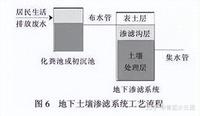 13、地下土壤渗滤系统:该系统将污水投配到土壤表面具有一定构造的渗滤沟中,污染物通过物理、化学、微生物的降解和植物的吸收利用得到处理和净化。工艺流程见图6。