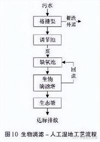 本技术适用于处理要求一般,规模较小,距离居民区较远的污水处理设施,处理规模10~30吨/天。工艺参数:集水池停留时间不小于12h,缺氧池停留时间不小于12h,生物滤塔负荷0.2~0.3m³/(㎡˙d),人工湿地水力负荷0.5~1.0/(m2˙d),污泥理周期180天,工艺流程见图10。