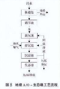 该技术适用于拥有自然池塘或闲置沟渠,地势条件易于收集污水,并能通过自流出水的且规模适中的村庄,处理规模20~200t/天。工艺参数:缺氧池停留时间不小于4h,好氧池停留时间不小于6h,生态塘停留时间不小于24h,污泥清理周期180天,工艺流程见图8。