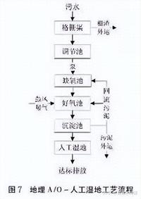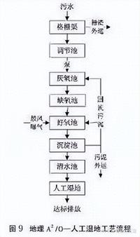 20、地埋A2/O-人工湿地技术:A2/O工艺亦称A-A-O工艺,本工艺为采用厌氧—缺氧—好氧法生物脱氮除磷工艺的简称,是流程最简单,应用最广泛的脱氮除磷工艺。适用于处理要求较高,四季气候变化大,气温较低的地区。处理规模不小于200吨/天。工艺参数:厌氧池停留时间不小于2h,缺氧池停留时间不小于4h,好氧池停留时间不小于6h,人工湿地水力负荷0.5~1.0m3/(m2˙d),污泥理周期180天,工艺流程见图9。