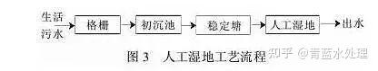 10、人工湿地:是利用人工水生态系统内多级生物的稀释降解作用来去除或削减水中污染物的方法。人工湿地作为一种新型生态污水处理技术具有投资和运行费用低、抗冲击负荷能力强、处理效果稳定、出水水质好、水生植物有一定经济价值等诸多优点。用于农村生活污水处理的主要是潜流人工湿地。人工湿地处理工艺流程图见图3。