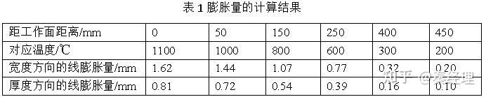能够导致“衬壳分离现象”的砖体膨胀作用主要发生在砖的宽度和厚度方向上,因此,我们主要来计算每块砖在250mm长度的不同温度段、宽度和厚度方向的线膨胀量,计算公式为:宽度方向的线膨胀量= 105×热膨胀率/100 ,厚度方向的线膨胀量= 75 ×热膨胀率/ 100 ,其中的热膨胀率参照上表1,计算的结果见。