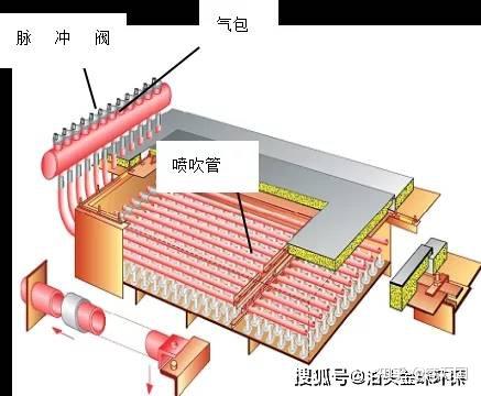 如图所示,袋式除尘器喷吹系统通常由支架、压气管路、气包、脉冲阀、喷吹管、控制仪表和阀等组成。喷吹管通过快速接头经弯管与气包相连,喷吹管的开口连接快速接头,封口瑞固定在支撑架上。喷吹管上的喷吹短管位于袋口上方并与袋口同心。收尘器的清灰动力来源于压缩空气,电磁脉冲阀控制压缩空气的释放,清灰控制仪控制整台收尘器的清灰。清除下来的粉尘落入灰斗经卸灰阀送往指定位置。