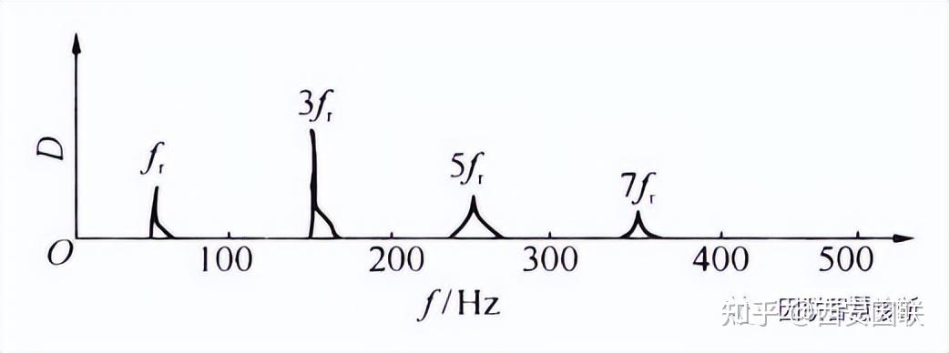 在一次设备巡检中,测点①~④的振动速度有效值(Vrms)在3~12mm/s范围内变动,在现场作简易频率分析时,这四个测点的主要频率都是60Hz,约为转频的5倍(转频fr=735 ÷60=12.25Hz)。当时判断电动机和转速器地脚螺栓可能存在松动。停机修理,发现减速器底部安装时加上的调整垫铁在点焊处已经炸裂松脱,经处理后问题得到了解决。这个松动故障的特征主要表现为频率奇数倍。