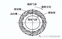 压缩机工作时,动环随转子一起转动,气体被引入动压槽,引入沟槽内的气体在被压缩的同时,遇到密封堰的阻拦,压力进一步升高。这一压力克服静环后面的弹簧力和作用在静环上的流体静压力,把静环推开,使动环和静环之间的接触面分开而形成一层稳定的动压气膜,此气膜对动环和静环的密封面提供充分的润滑和冷却。气膜厚度一般为几微米,这个稳定的气膜使密封端面间保持一定的密封间隙。气体介质通过密封间隙时靠节流和阻塞的作用而被减压,从而实现气体介质的密封,几微米的密封间隙会使气体的泄漏率保持最小。