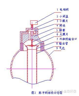 随着滤袋表面粉尘不断增加,除尘器进出口压差也随之上升。当除尘器阻力达到设定值时,控制系统发出清灰指令,清灰系统开始工作。首先电磁阀接到信号后立即开启,使小膜片上部气室的压缩空气被排放,由于小膜片两端受力的改变,使被小膜片关闭的排气通道开启,大膜片上部气室的压缩空气由此通道排出,大膜片两端受力改变,使大膜片动作,将关闭的输出口打开,气包内的压缩空气经由输出管和喷吹管喷入袋内,实现清灰。当控制信号停止后,电磁阀关闭,小膜片、大膜片相继复位,喷吹停止。
