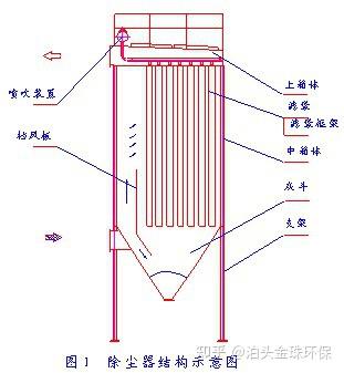 含尘气体由灰斗上部进风口进入后,在挡风板的作用下,气流向上流动,流速降低,部分大颗粒粉尘由于惯性力的作用被分离出来落入灰斗。含尘气体进入中箱体经滤袋的过滤净化,粉尘被阻留在滤袋的外表面,净化后的气体经滤袋口进入上箱体,由出风口排出。