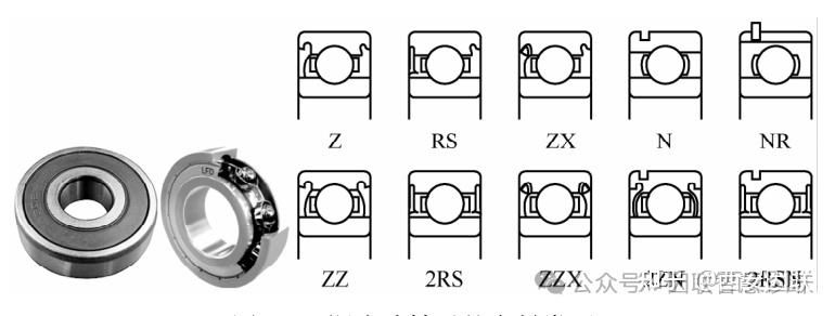 很多小型球轴承有各种密封装置,用于封住内部的油脂和防止外面的粉尘进入(所以也称为“防尘盖”),并分单边和双边两种,用字母和数字标注在规格型号后面,单边的称为Z型,双边的称为2Z型,常用的有: “-Z”(轴承一面带防尘盖,如6210-Z)、“-2Z”(轴承两面带防尘盖,如6210-2Z)、“-RZ”(轴承一面带非接触式骨架橡胶密封圈,如6210-RZ)、"-2RZ”(轴承两面带非接触式骨架橡胶密封圈,如6210-2RZ)、"-RS”(轴承一面带接触式骨架橡胶密封圈,如6210-RS)、"-2RS"(轴承两面带接触式骨架橡胶密封圈,如6210-2RS)等。如图2所示。