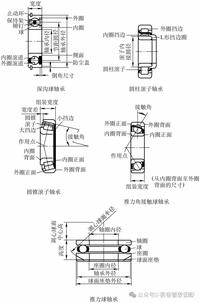 常用的单列深沟球轴承、单列圆柱滚子轴承、圆锥滚子轴承、推力角接触球轴承和推力球轴承的部件及各部位的名称如图1所示。