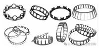 保持架有用于球轴承的波浪式和柱式及用于圆锥滚力轴承的花篮式、筐式等多种形式,波浪式的材质一般用钢材冲压制成,花篮式的材质则有实体黄铜、实体青铜、工程塑料、钢或球墨铸铁、钢板冲压、铜板冲压等多种。其形状如图3所示,保持架所用材料的字母和数字代号见表1。