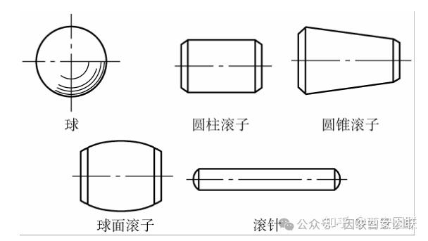 滚子按其形状分为球形、圆柱形(含短圆柱形、长圆柱形和滚针形)、圆锥形(实际为圆台形)、球面形(鼓形)等几种。如图4所示。