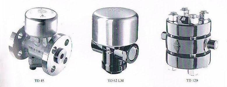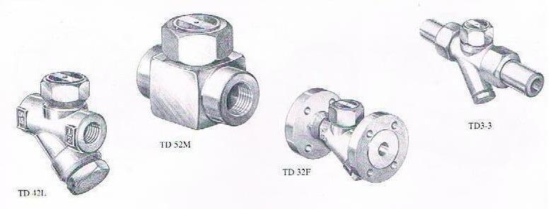 斯派莎克SpiraxSarco疏水阀:热动力疏水阀结合了安全可靠、结构简单和效率高的特点,其最大工作压力可达120bar g。斯派莎克SpiraxSarco疏水阀:TD热动力疏水阀系列的用户遍及全世界的原因在于以下各项特点:1、本体结构结实、简单、重量轻、操作压力范围大。2、只有一个活动部件、一个硬化的不锈钢蝶片,具有很长的使用寿命。同时可具止回阀的功能。3、间歇喷放排水及迅速紧密的关闭,保证无泄漏。4、可承受过热、水锤、冷冻、腐蚀性冷凝水。蝶片落入阀座时发出“喀嚓”声,便于检测工作性能。5、在任何安装位置下均能正常工作。6、有各种不同的型号,可选择螺纹、法兰、焊接等连接方式。