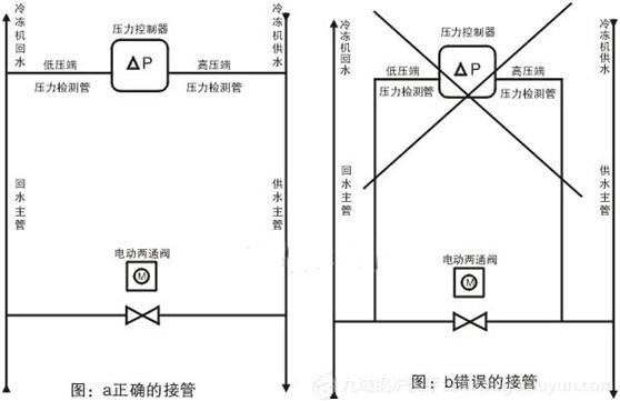 图b中.压差控制器检测的是供/回水总管的旁通阀两端的压力差,检测到的只是供/回水的分压力差,所以控制是不准确的。