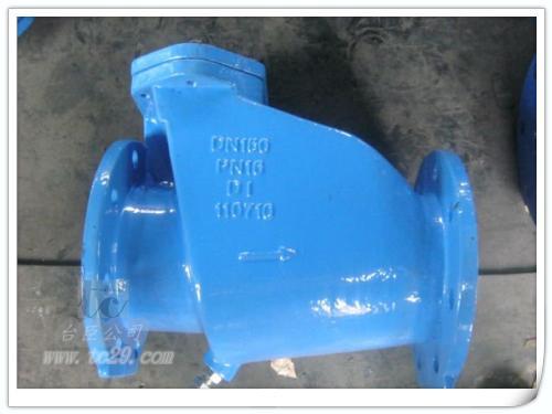 4.工作原理:微阻缓闭消声止回阀主要由阀体、阀盖、阀瓣组件、活塞组件、针型阀(微量调节阀)、重锤组成。靠进口介质的推力作用,将阀瓣自动推开,当阀瓣全开后,平衡锤倒向阀瓣的反面,起到了平衡部份阀瓣重量的目的,减少了因阀瓣重量对水流的压力(阻力)。另外阀体内的压力水通过针型阀流进活塞的后腔,将活塞全部推入。当水流突然停止时(电机断电),由于阀瓣的部分自重和倒流水的推力作用,使阀瓣自动关闭,但是由于活塞杆处于顶端位置,使闪瓣不能全部关闭,还剩有20%(可调节)左右的面积使水流通过,减弱了水锤压力。阀瓣的尖端压在活塞顶上,而活塞后腔的水阻碍活塞退回,亦即阻止阀瓣关闭,这股水只能通过针型阀缓缓流回阀体,使阀瓣缓缓关闭。阀瓣分成快速和缓慢两步关闭,达到了既防电机逆转又减弱水锤的作用。活塞杆伸出的长短决定了阀瓣缓闭的开度。越长则缓闭开度大,水锤小,但延长关闭时间,反之越短则缓闭开度小,会产生破坏性水锤。为此开度调节杆⑴应慎重调整。管路的长短决定水锤峰值的周值。为了适应各种系统的缓闭时间的要求,本阀侧面安装了一针型阀(微量调节阀)⑺,可根据水锤峰值到来的时间长短,产生水锤的大小和水泵倒转速度等,准确的控制活塞后腔压缩水的流量,也就是控制阀瓣缓闭时间,这个时间可以在0~60秒内任意调节。