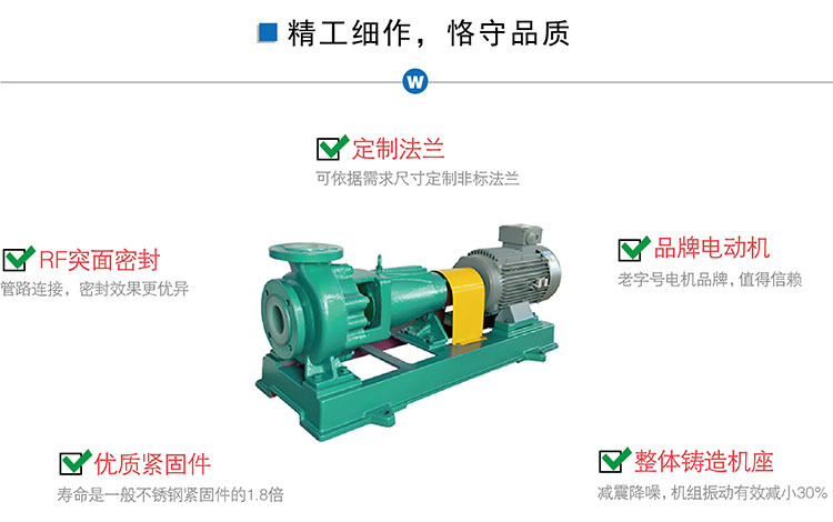 产品简介IHF(L)系列泵壳为衬塑工艺,过流部件均采用高温退火工艺,广泛运用于碱、苯、化成箔、酸洗、农药、造纸、钢铁等行业。能够输送强腐蚀性酸、碱、盐、有机溶剂等介质。特点:结构紧凑;抗氧化性好;无毒素分解;泵腔流道饱满效率高;可长时间在-20℃—150℃温度的条件下稳定运行(耐高温材料需向我司咨询)。产品优势1.IHF氟塑料磁力泵过流部件采用高温退火工艺,此道工艺可充分释放出衬里塑料的内应力,避免开裂现象。同时衬里塑料与金属面贴合更紧密,即使处在高温环境下工作,衬塑层依然牢固稳定。2.IHF的轴承箱内圆进行了抛光工艺处理,这样做的好处在于提高表面硬度,由HR15提高到HR35。方便轴承拆装,在装配过程中不会造成轴承敲击变形;轴承箱抗机械疲劳强度增加,提高轴承使用寿命。3.轴承箱内放置波纹弹簧,将原有的公差尺寸变成可调节的弹性尺寸,配合轴承箱内圆抛光工艺,能够避免轴承发热现象,使轴承使用寿命延长至原来的1.5倍。4.如果对国产的哈轴、瓦轴、洛轴信心不足的话,我们可为您配置进口轴承,如:日本精工NSK轴承,瑞典SKF轴承。二者在价格上有一定的落差。5.装配二级能耗的YE3高效节能电机,电能消耗超低。价格虽略贵于YX3电机,但日均可节约电能达3%-8%。6.IHF机械密封选用的是WB2机封,利于平衡内外压力波纹弹性更具弹性,间隙更大,适合输送有颗粒的介质,辅助对磨面形成水膜。且根据工况特性,有多种对磨面以供选择。