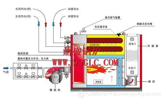 燃气真空热水锅炉的下半部结构与普通锅炉一样,由燃烧室与传热管组成;其下半部装有热媒介(炉水),上部为真空汽室,其中插入了U型管(或直管型)热交换器。由于锅炉整体是在负压状态下运行,故绝对安全。炉内的热媒介(炉水),在锅炉运行的全过程中,不进、不出、不增、不减,只封闭在锅炉的真空室内,在锅炉的传热管与热交换器之间传递热量。炉内的热媒介是完全脱氧的纯净水,无腐蚀,无水垢,使锅炉寿命长达20多年甚至更长。