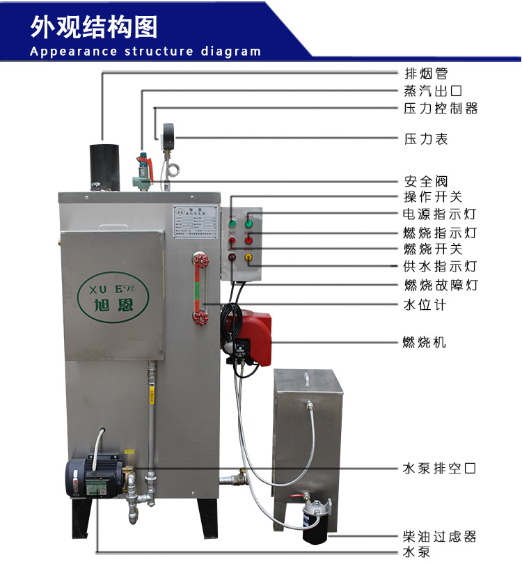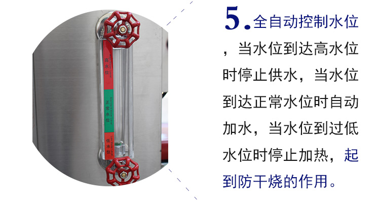 6、 在使用本产品时请注意排污。每天用完锅炉需排放并且带0.15MPa~0.25MPa的压力排放,可以防止管道堵塞.排污管应妥善连接,谨防烫伤。