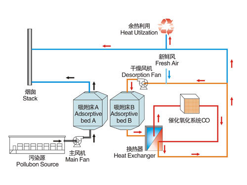 3、脱附气体流程:当活性炭微孔吸附饱和时,将不能再进行吸附,此时利用催化床产生的高温热风对活性炭进行脱附,活性炭微孔中的有机物遇高温后自动脱离活性炭,使活性炭再生。脱附下来的有机物已被浓缩(浓度较原来提高几十倍)并被送入催化燃烧室进行催化燃烧,在催化剂上于250~300℃进行催化氧化,使其转化为无害的CO2和H2O排出,当有机废气浓度达到2000PPm以上时,有机废气在催化床可维持自燃,不用另外再行加热,燃烧后的尾气一部份直接排到大气,大部份热气流被再次循环送往吸附床,用于对活性炭的脱附再生。这样既能满足燃烧和脱附所需热能,又能达到节能的目的,再生后的活性炭可用于下次吸附。