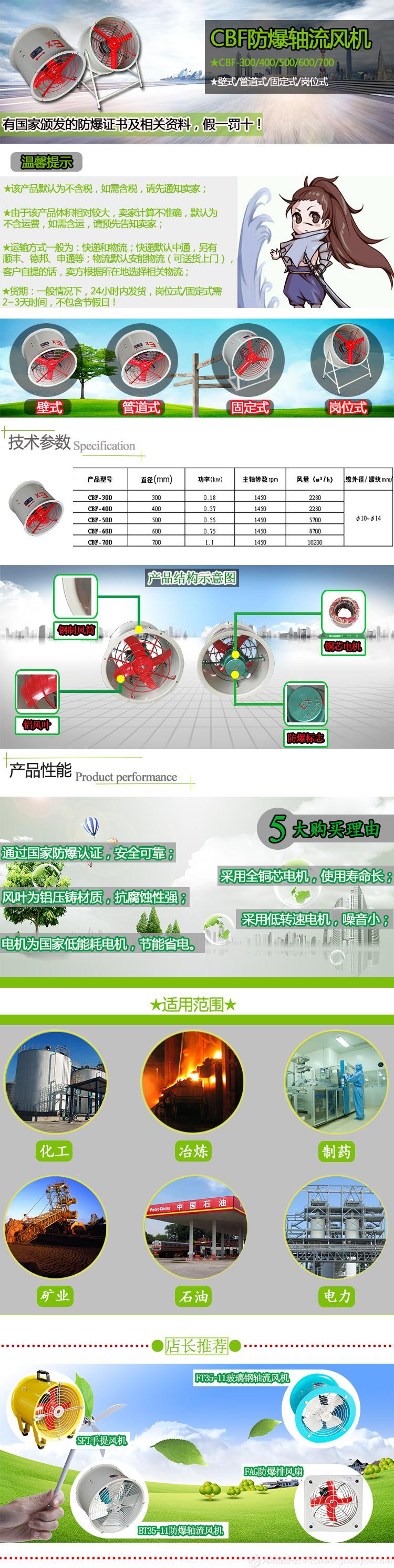 ①采用全铜芯防爆电机,使用寿命长,功率足,风量大;