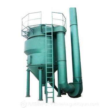 过滤工况—含尘气流由切向进入过滤室上部空间,由於入口为蜗壳型。大颗粒及凝聚尘粒在离心力作用下沿筒壁旋落灰斗。小颗粒尘弥散于过滤室袋间空隙从而被滤袋阻留。粘附在滤袋外层,净化空气透过滤壁经花板上滤袋导口汇集于清洁室,由通风机吸出而排放于大气中。