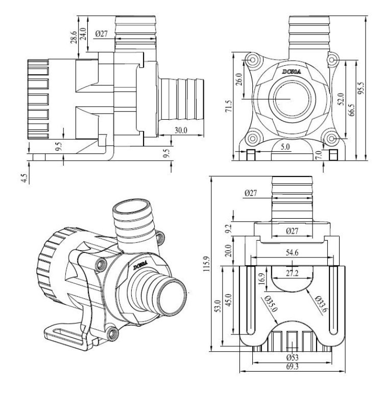 参数表(仅供参考,水泵24V扬程调制范围3~5M,12V扬程,范围2-3.5M)型号电压最大负载电流最大扬程最大流量最大功耗V (dc)AmL/HWDC50A-1225T122.02.50200024DC50A-1225SDC50A-1225ADC50A-1235S123.803.50300045.6DC50A-1235ADC50A-2435T242.03.50300048DC50A-2435SDC50A-2435ADC50A-2450S243.605.00360086.4DC50A-2450A选型注意事项 选型时务必给出使用环境:例如连续工作时间、水温、介质等,水泵功率超过一定的功率就不适合长期在60度或者100度以上水温连续工作,务必与技术员沟通以便选择最合适的水泵!上述电流为水泵的开口电流即当水泵直接放入水中不接任何系统时的电流,也为水泵最大电流,当水泵接上系统之后水泵的工作电流会降低到最大负载电流的70%-85%。 水泵的扬程为最大送水高度,即到达最大扬程点的流量为零。 水泵的流量为水平流量,即水平抽水的流量。两相直流水泵与三相直流水泵(无传感器智能)的区别两相(T系列) 传感器驱动,电路板必须内置,无法通过智能方式调速启动有冲击三相(S/A系列) 直流三相指的是无传感器智能驱动,电路板可外置(泵体可以耐高温) 可调速(PWM、0~5V模拟信号、电位器调速)【选配】 堵转及反接保护,过压过流保护,过温保护 软启动,启动电流低,无冲击,特别适用于太阳能板直接供电