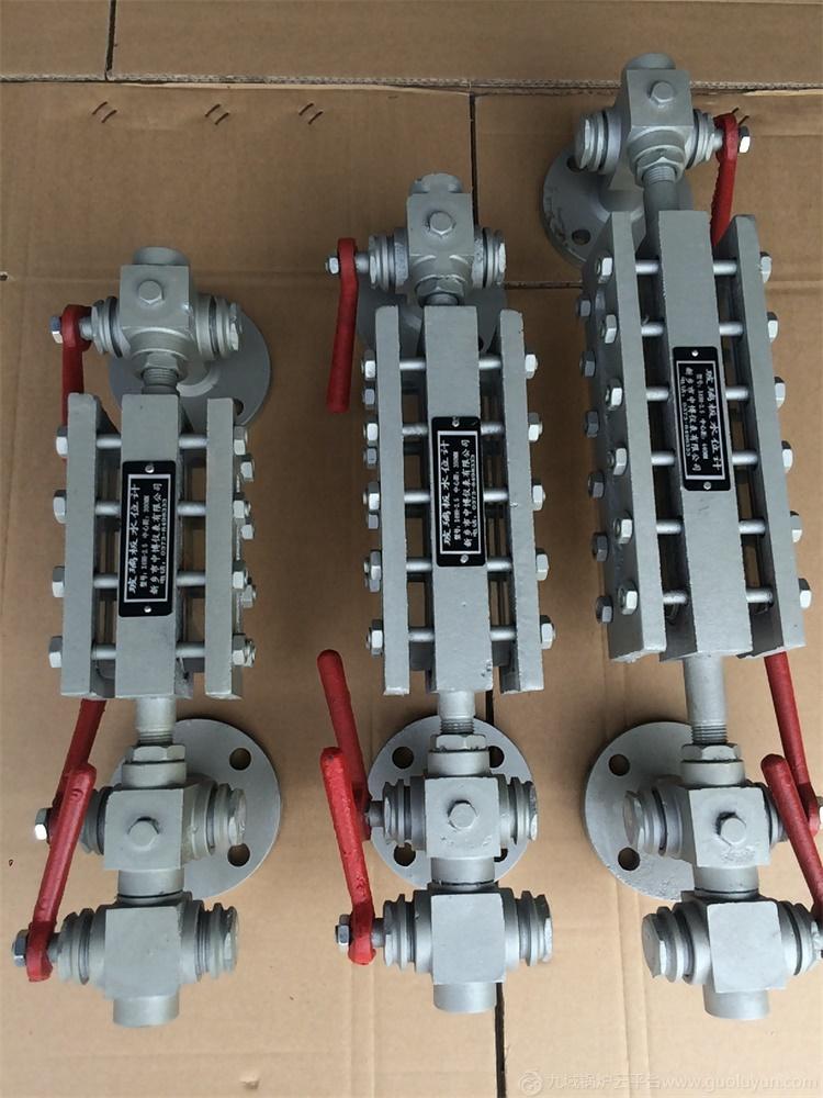 仪表的上下旋塞阀上焊有法兰与容器连接构成连通器,透过玻璃板可直接读得容器内的液位高度。并可以不停炉清洗和更换玻璃管。当玻璃管因意外损坏时,借助手柄将上,下旋塞阀的塞子转过90°,可阻止容器内的介质继续外流。液面计下端装有排污阀,供检修时放出剩余液体及清洗内部之用。