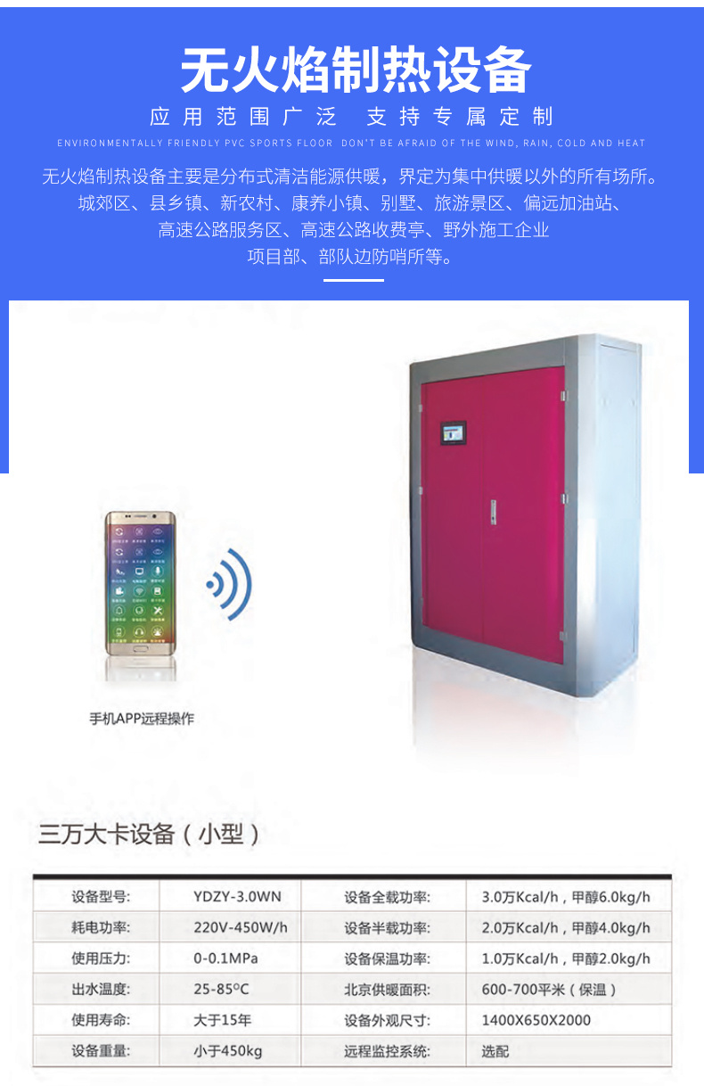 | 主营产品或服务 | 本公司供就无火焰供暧设备, 专业供应甲醇无火焰供暧设备,零污染排放,安全节能高效,是目前市场上供暧设备成本的一半,技术先进,可实现中央地暧、空调、暧片、热水多功能一体机,适用于民宿、别墅、公寓、会所、野外工程作业。 | ||
